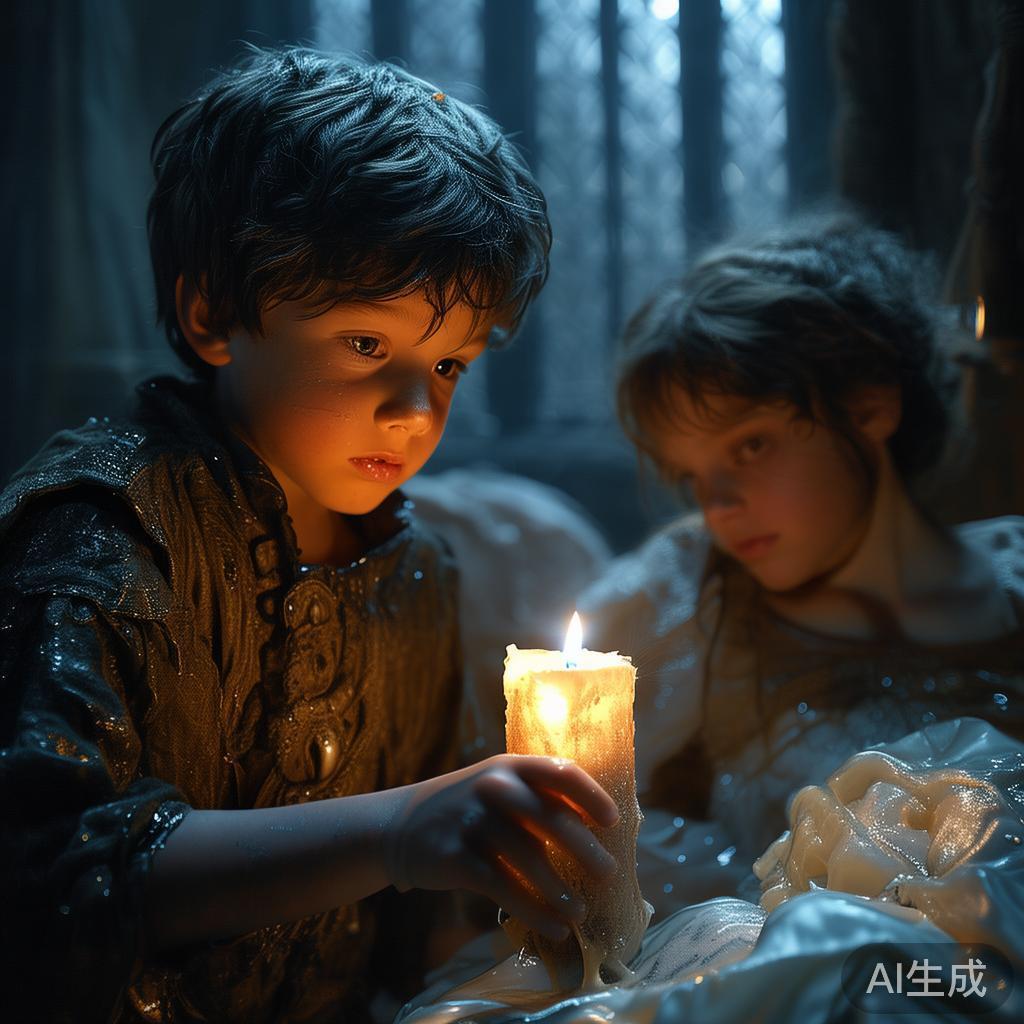听到这里,他母亲忍不住插嘴说:“这恐怕不好,你得带根圣烛去。”所以这孩子又得趁夜回去了,虽然心里七上八下,但为了救人,不得不这样做。在公主们睡觉的时候,他悄悄滴上几滴溶化蜡烛,结果,她们脸上的白色居然变多了!