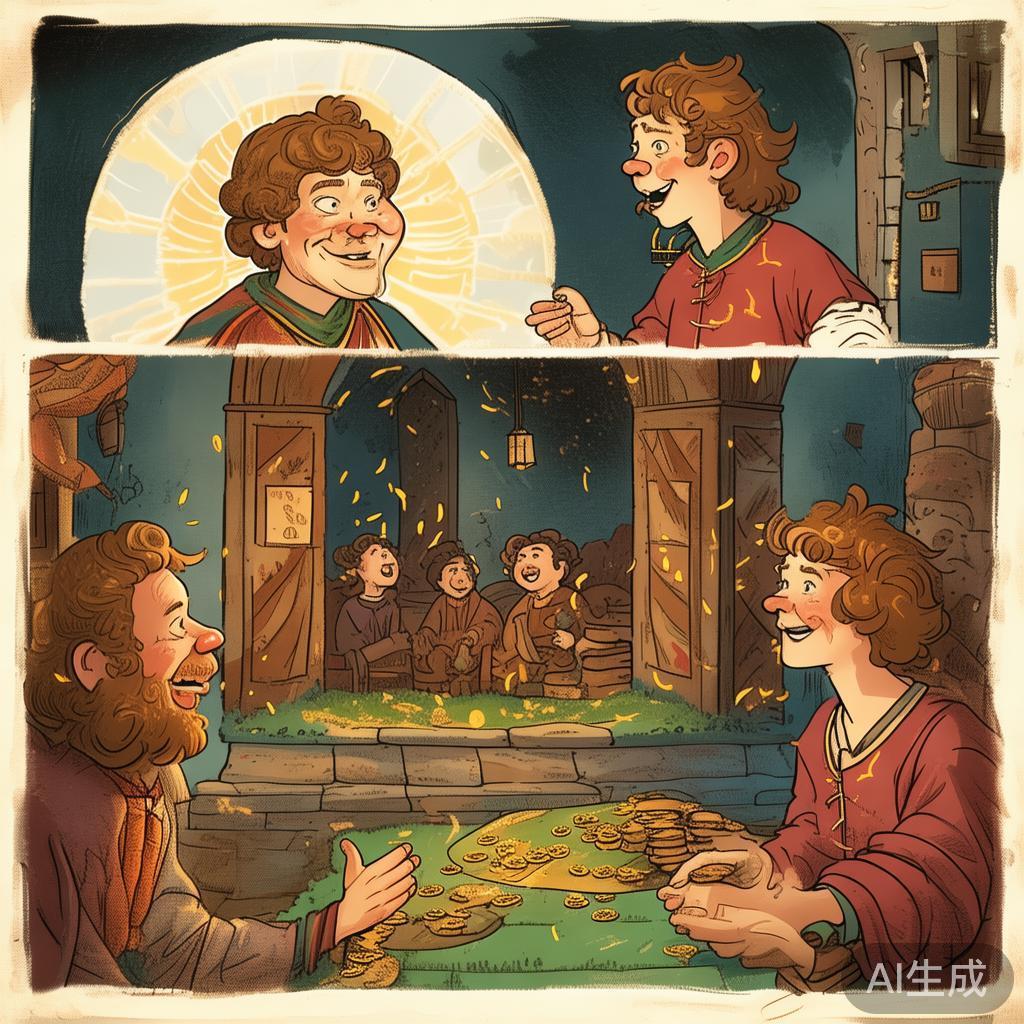 随后,他沿另一条路悄悄从窗户逃出,以最快速度赶回同伴身边,把整个计划和谜底传达给了他们。他们开心得手舞足蹈,欢呼着提起鞭子,金子满地乱滚。