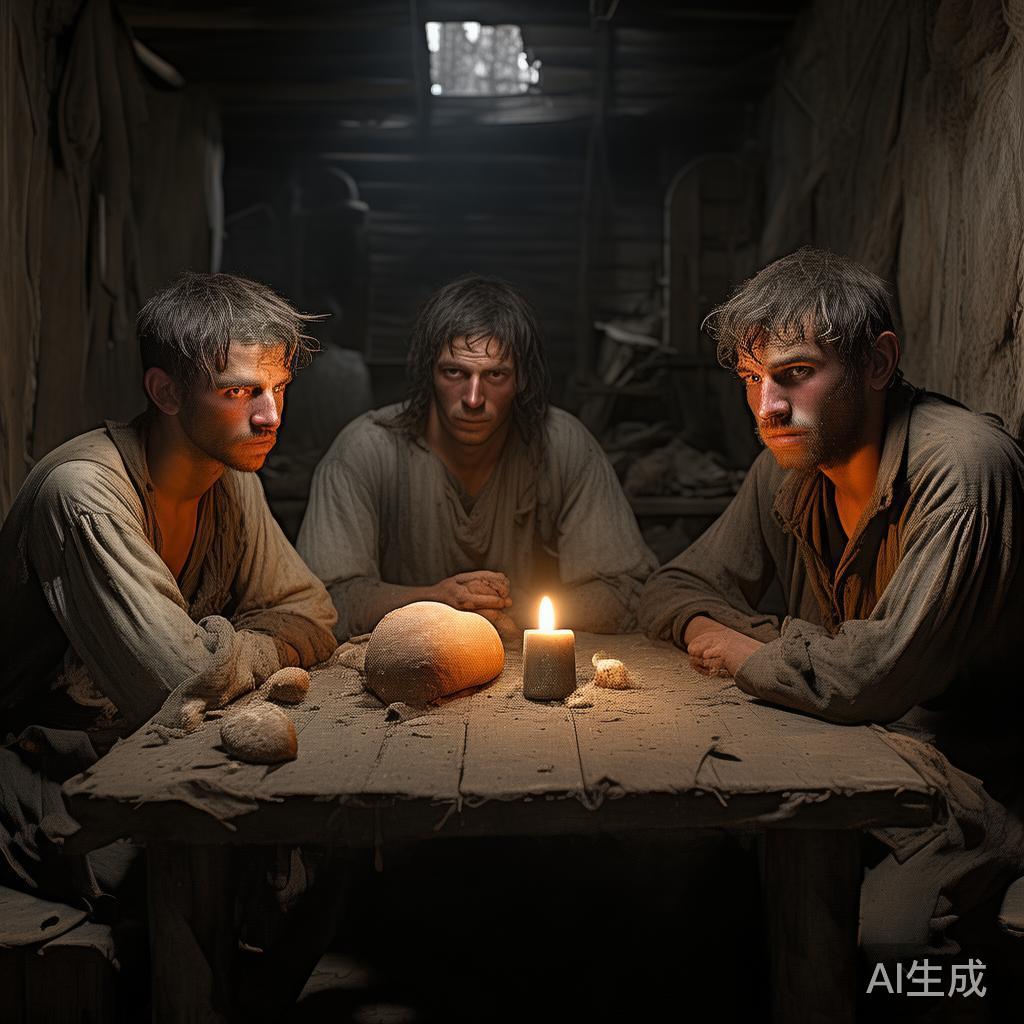 士兵们叹了口气,说道:“我们三个都是当兵的,因为拿不到应得的钱,只好当逃兵。可是待在这里,我们只会饿死,就算出去也是个死法。”