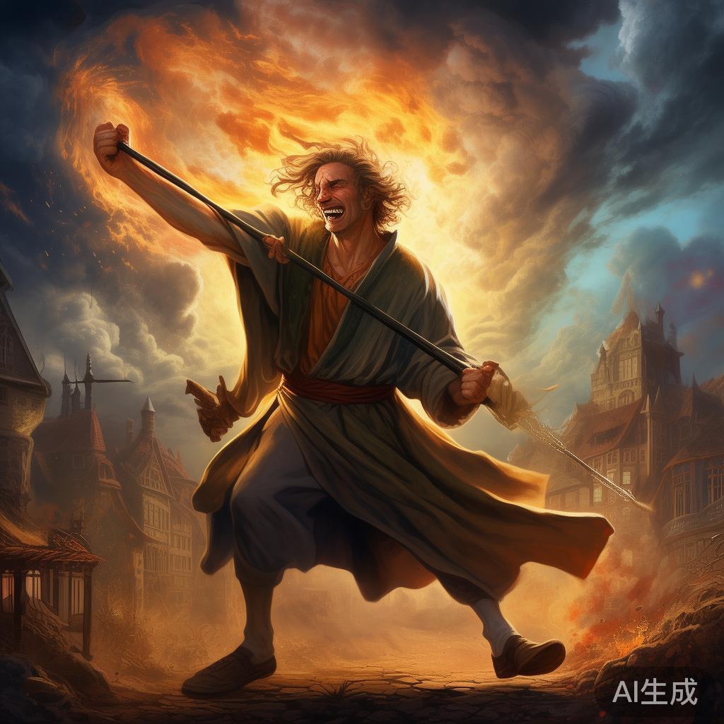 邻居们听见动静过来帮忙,但在这些装备精良的士兵面前他们显得束手无策。而这一情况吸引了国王的注意,他立即派人处理这个捣乱的小子。可是小伙子轻松搞定了,一通强劲的士兵支配下,国王的队伍纷纷败逃。